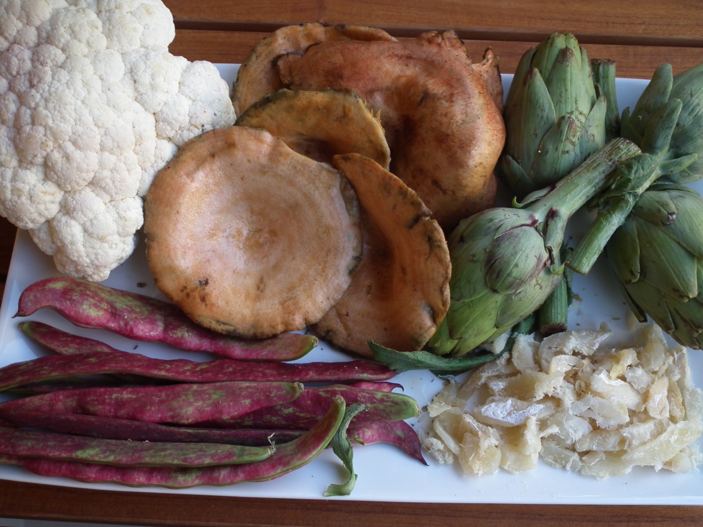 Lorsque l'huile est chaude, ajouter les légumes et la morue. Ils seront ajoutés un par un toutes les deux minutes environ, afin de cuire uniformément les ingrédients. Nous commençons par le chou-fleur, deux minutes plus tard l'artichaut, plus tard la morue, les haricots verts, la tomate au naturel et 12 minutes plus tard les bouchons de lait au safran qui nécessitent moins de temps.