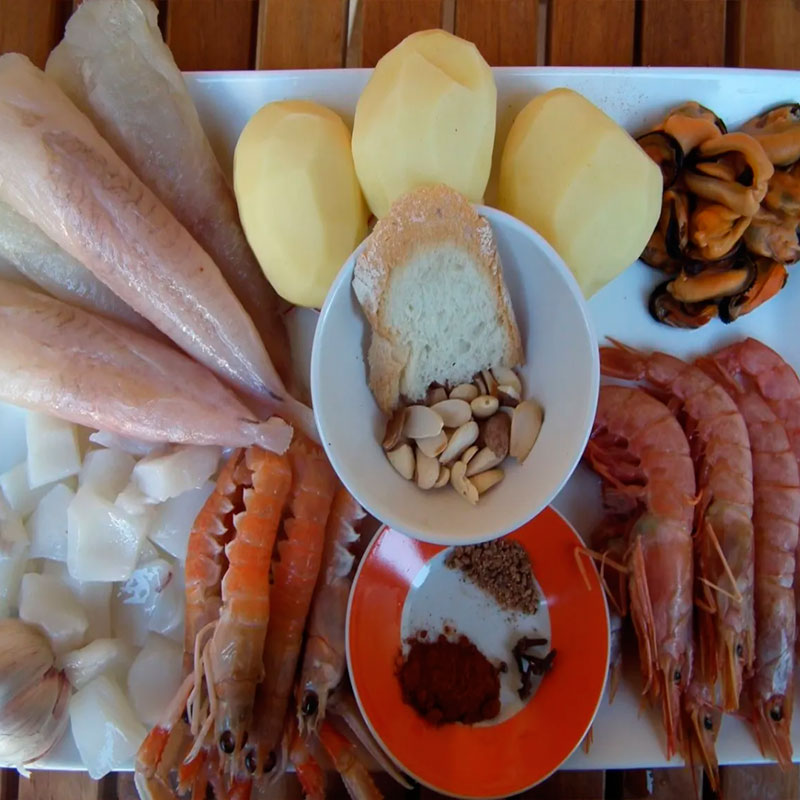 Lorsque les seiches sont dorées, ajouter le fumet de poisson préalablement préparé. Pour le fumet, nous avons utilisé : ½ kg de poissons de roche et une grosse tête de lotte et de mérou. Porter à ébullition à feu doux pendant 45 minutes à 1 heure et au bout de ce temps, filtrer le fumet et le réserver.
